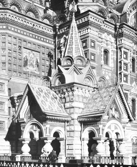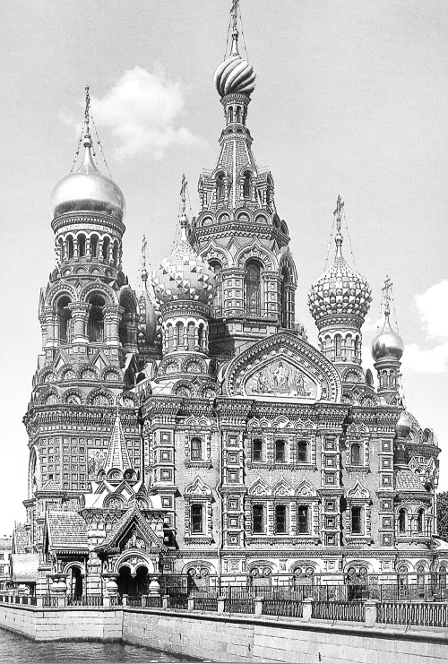 Показательно, что, хотя храм Василия Блаженного не был в числе исходных прототипов, впоследствии Парланд находил параллель с этим величайшим произведением древнерусского зодчества. В издании о церкви Воскресения он даже пренебрег хронологией и включил памятник в ряд «выдающихся образцов времен московских царей XVII века»[103]103