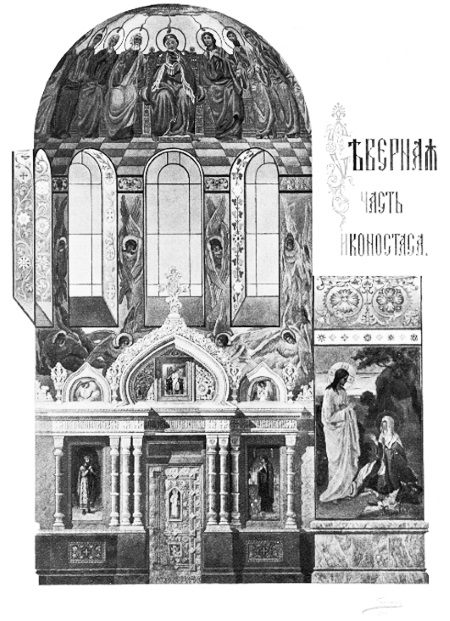 Осенью того же года оконченную вчерне постройку осматривали представители Санкт-Петербургского общества архитекторов, выразившие восхищение тщательностью исполнения всех конструктивных частей здания и деталей его отделки. Среднюю, надалтарную главу по предложению художника П.П. Чистякова выложили золоченой смальтой (работа мозаичной мастерской Фроловых). Главы боковых апсид и колокольни покрыты в 1897-1900 годах золоченой медью. Правда, здесь случился казус. Купол колокольни быстро потемнел, и в 1911-1913 годах позолоту заменили кантарельным покрытием под наблюдением В.А. Фролова.
