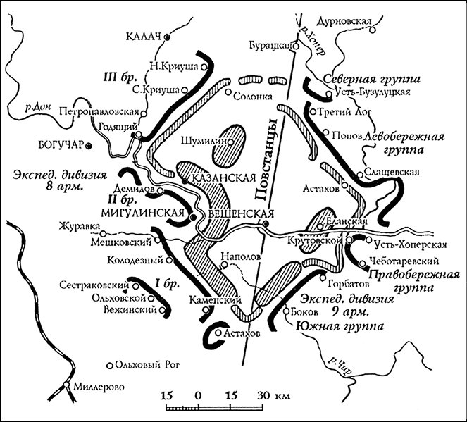 В начале 1919 года воронежский фронт Донской армии разложился и открыл путь красным в верховья Дона. Во многом это произошло из-за того, что после поражения Германии и ее союзников в Первой мировой войне значительно ухудшилось снабжение Донской армии боеприпасами. Полки, состоявшие из уроженцев верхнедонских станиц, разошлись по домам. Однако репрессии, проводимые большевиками в рамках политики расказачивания согласно директиве Оргбюро от 24 января 1919 года, очень скоро вызвали недовольство казаков занятого большевиками Верхне-Донского округа. Было расстреляно от 300 до 600 казаков. Недовольство вызывали реквизиции продовольствия. 10 марта вспыхнуло восстание в хуторе Шумилином Казанской станицы. 11 марта восставшие заняли станицу Мигулинскую и уничтожили карательный советский отряд, а 12 марта атаковали Вешенскую. Восстание начали пять станиц – Казанская, Еланская, Вешенская, Мигулинская и Шумилинская. Во главе восстания стал бывший начальник пулеметной команды 1‐го Вешенского конного полка Донской армии хорунжий Павел Кудинов, один из инициаторов оставления фронта верхнедонскими полками, при Советах назначенный начальником военного отдела Вешенского исполкома. 20 марта 1919 года Вешенский повстанческий полк разгромил большой советский отряд, захватил несколько орудий и взял Каргинскую, а затем и Боковскую. Восстание охватило весь Верхне-Донской округ и часть Усть-Медведицкого Хоперского. В воззвании восставших говорилось: «Верхнедонцы не могут быть рабами коммунистов. Прочь колебания. Мы победим и скоро-скоро сомкнем свои ряды. Да здравствует демократическая Россия и Войско Донское!» Была объявлена всеобщая мобилизация. Численность повстанцев в начале восстания составляла около 15 тыс. человек, а к концу восстания возросла до примерно 30 тыс. человек. У восставших было 6 орудий и 27 пулеметов. Они были организованы в пять дивизий и отдельную бригаду, в конце мая развернутую в 6‐ю повстанческую дивизию. Против повстанцев были брошены две сводные экспедиционные дивизии 8‐й и 9‐й армий под командованием Тихона Хвесина, общей численностью более 20 тыс. человек. В мае им на помощь была брошена 33‐я Кубанская дивизия. Бои были ожесточенные, пленных не брали. Погибшие с обеих сторон исчислялись тысячами. Но красные имели огромное преимущество в патронах и снарядов, которых у повстанцев было очень ограниченное количество. И красные постепенно теснили повстанцев, хотя некоторое число снарядов и патронов доставлялось им из Донской армии воздушным путем. В телеграмме 17 мая в телеграмме Реввоенсовету Южного фронта Ленин возмущался: «Не понимаю, почему не выписываете больше рабочих и переселенцев на Дон. Сообщайте два раза в неделю, насколько энергично идет призыв переселенцев и подавление восстания». Но 28 мая – 2 июня Донская армия перешла в наступление, и 7 июня конная группа генерал-майора Александра Секретева (8‐я, 11‐я и 12‐я Донские дивизии) у станицы Казанской соединилась с Вешенскими повстанцами. Это способствовало расширению восстания. 29 мая (11 июня) начальник штаба конной группы Секретева полковник Константин Калиновский докладывал: «В Хоперском округе вспыхнуло восстание… Хоперцы местных хуторов присоединяются к нашим войскам целыми сотнями. Двинута сотня для овладения станицей Тишанской». 12‐я Донская дивизия 12 июня