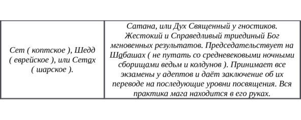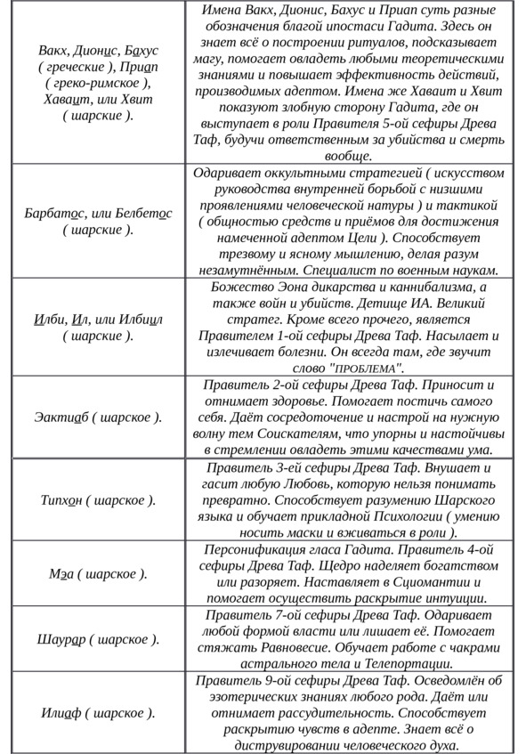 А теперь дадим имена некоторых демонов, помещая оные в таблицу, с присоединением тех основных и общих занятий, которые соответствуют их Истинным Желаниям. Чертой под буквой в имени обозначена ударная гласная.