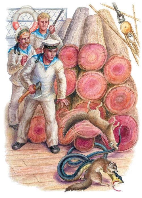 Наконец удалось немножко подсунуть нож. Но мачты поднимались вместе с палубой. А мачтам не давали подниматься эти верёвочные лесенки, что шли от мачт к бортам. Их надо было отрезать – иначе никак. Я на миг остановился. Всего только на миг. Но сейчас же торопливой рукой стал резать эти лесенки. Пилил их тупым ножом. Готово, все они повисли, мачты свободны. Я стал ножом приподнимать палубу. Я боялся сразу дать большую щель. Они бросятся все сразу и разбегутся. Я оставил щёлку, чтобы пролезть одному. Он полезет, а я его – хлоп! – и захлопну, как жука в ладони.