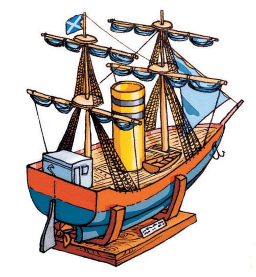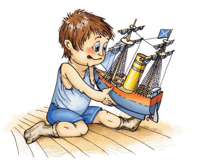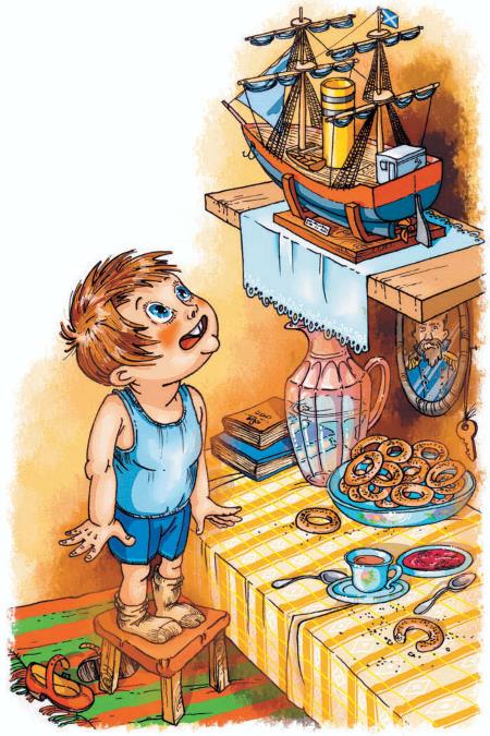 Когда я был маленький, меня отвезли жить к бабушке. У бабушки над столом была полка. А на полке пароходик. Я такого никогда не видал. Он был совсем настоящий, только маленький. У него была труба: жёлтая и на ней два чёрных пояса. И две мачты. А от мачт шли к бортам верёвочные лесенки. На корме стояла будочка, как домик. Полированная, с окошечками и дверкой. А уж совсем на корме – медное рулевое колесо. Снизу под кормой – руль. И блестел перед рулём винт, как медная розочка. На носу два якоря. Ах, какие замечательные! Если б хоть один у меня такой был!