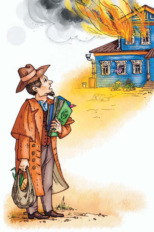 Учитель шёл домой и увидал, что из верхних окон идёт дым. Он побежал к столбику, где за стеклом была сделана кнопка. Это звонок к пожарным.