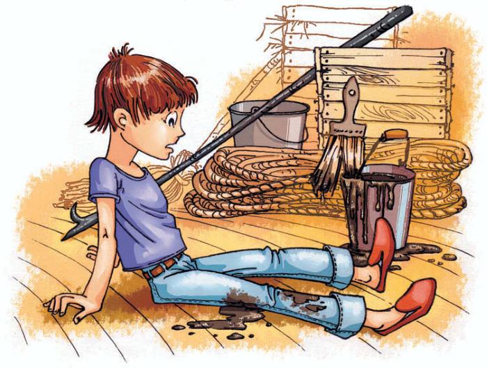 Вдруг бородатый перешёл с кисточкой на другую сторону мазать. Увидал меня да как крикнет: «Подай ведёрко! Что, у меня десять рук, что ли? Стоит, тетеря!» Я увидал ведёрко со смолой и поставил около него. А он опять: «Что, у тебя руки отсохнут – подержать минуту не можешь!» Я стал держать. И очень рад был, что не выгнали. А он очень спешил и мазал наотмашь, как зря, так что кругом дёготь брызгал, чёрный такой, густой. Что ж мне, бросать, что ли, ведёрко было? Смотрю, он мне на брюки капнул раз, а потом капнул сразу много. Всё пропало: брюки серые были.