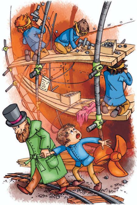 Пошли туда, а там леса поставлены, вот как дом в пять этажей строят. Леса эти около судна нагорожены. А судно из ржавых листов, толщенных, и листы эти к железным рёбрам рабочие крепят. А по лесам на досках все мастеровые, на полках, как мухи. Мне сразу показалось, что все пистолетами, только пистолеты на толстых верёвках. Теперь-то я знаю, что это воздушный молоток, и не на верёвке, а это трубка к нему идёт, и по ней сжатый воздух гонят от насоса. А в стволе воздухом работает самый молоток: мечется взад и вперёд, и если к чему ствол приставить, так бьёт шибко, дробно. А тогда мне показалось, что пистолеты.