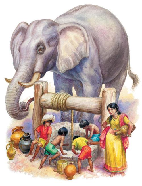 Индуска орёт на слона – слон нехотя повернулся и пошёл к колодцу. У колодца врыты два столба, и между ними вьюшка; на ней верёвка намотана и ручка сбоку. Смотрим: слон взялся хоботом за ручку и стал вертеть; вертит как будто пустую, вытащил – целая бадья там на верёвке, вёдер десять. Слон упёрся корнем хобота в ручку, чтобы не вертелась, изогнул хобот, подцепил бадью и, как кружку с водой, поставил на борт колодца. Баба набрала воды, ребят тоже заставила таскать – она как раз стирала. Слон опять бадью спустил и полную выкрутил наверх. Хозяйка опять его начала ругать. Слон пустил бадью в колодец, тряхнул ушами и пошёл прочь – не стал воду больше доставать, пошёл под навес. А там в углу двора на хлипких столбиках навес был устроен – только-только слону под него подлезть. Сверху камышу накидано и каких-то листьев длинных.