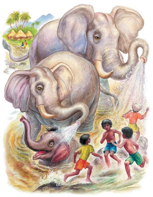 А ребята боятся в воду лезть – больно уж быстрое течение, унесёт. Скачут на берегу и давай в слона камешками кидать. Ему нипочём, он даже внимания не обращает – всё своего слонёнка моет. Потом, смотрю, набрал в хобот воды и вдруг как повернёт на мальчишек и одному прямо в пузо как дунет струёй – тот так и сел. Хохочет, заливается.
