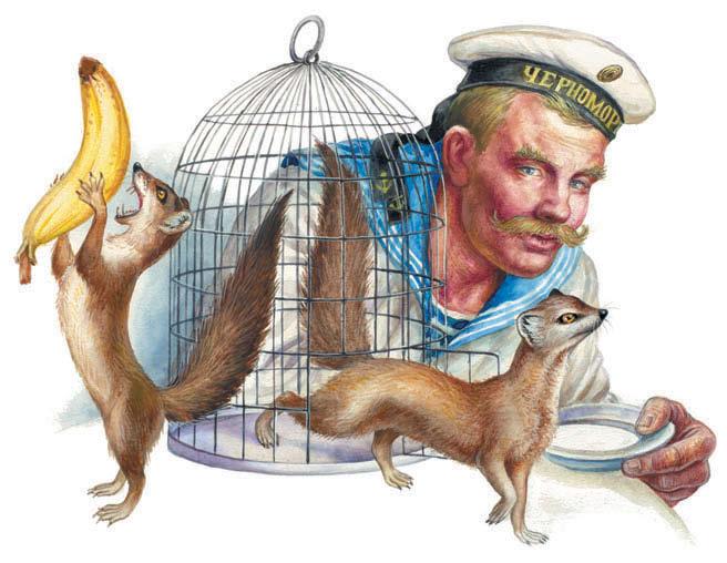 Мне скорей захотелось взять на руки, погладить эту, что кусает для шутки. И только я приоткрыл клетку, эта самая мангуста – юрк! – и уж побежала по каюте. Она суетилась, бегала по полу, всё нюхала и крякала: «кррык! кррык!» – как будто ворона. Я хотел её поймать, нагнулся, протянул руку, и вмиг мангуста мелькнула мимо моей руки и уже в рукаве. Я поднял руку – и готово: мангуста уж за пазухой. Она выглянула из-за пазухи, крякнула весело и снова спряталась. И вот слышу: она уже под мышкой, пробирается в другой рукав и выскочила из другого рукава на волю. Я хотел её погладить и только поднёс руку, как вдруг мангуста подскочила вверх сразу на всех четырёх лапах, как будто под каждой лапой пружинка. Я даже руку отдёрнул, будто от выстрела. А мангуста снизу глянула на меня весёлыми глазками и снова: «кррык!» И смотрю – уж сама на колени ко мне взобралась и тут свои фокусы показывает: то свернётся, то вмиг расправится, то хвост трубой, то вдруг голову просунет меж задних ног. Она так ласково, так весело со мной играла, а тут вдруг постучали в каюту и вызвали меня на работу.