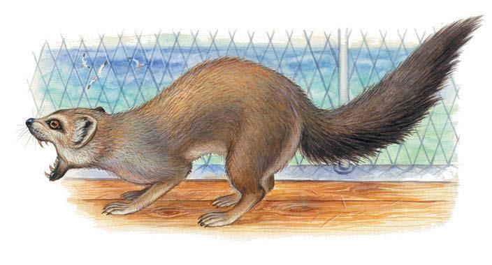 Эге! Пришлось перевесить бананы к самой середине каюты: мангуста уже пробовала по полотенцу вскарабкаться повыше. Лазила она, как обезьяна: у неё лапки как ручки. Цепкие, ловкие, проворные. Она совсем меня не боялась. Я выпустил её на палубу погулять, на солнце. Она сразу по-хозяйски всё обнюхала и бегала по палубе так, будто она и сроду нигде больше не была и тут её дом.