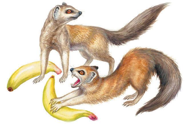 Я выпросил у повара мяса, накупил бананов, притащил хлеба, блюдце молока. Всё это поставил посреди каюты и открыл клетку. Сам залез на койку и стал глядеть. Из клетки выскочила дикая мангуста, и они вместе с ручной прямо бросились на мясо. Они рвали его зубами, крякали и урчали, лакали молоко, потом ручная ухватила банан и потащила его в угол. Дикая – прыг! – и уж рядом с ней. Я хотел поглядеть, что будет, вскочил с койки, но уж поздно: мангусты бежали назад. Они облизывали мордочки, а от банана остались на полу одни шкурки, как тряпочки.