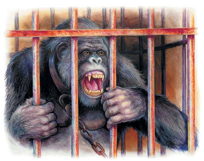 Теперь ясно видно стало: сарай был надвое разделён решёткой, железными прутьями в палец толщиной, если не толще; низ их уходил в помост, верх был заделан в потолок. И там, за решёткой, на помосте, стоял, держась за прутья… кто? Сначала показалось, что человек в лохмотьях. Нет! Огромная обезьяна. Она глядела на людей большими чёрными глазами, страшными потому, что как будто из человечьих глаз смотрели собачьи зрачки, и пламенная, неукротимая ненависть была в этом взгляде. Низкий лоб и короткие волосы острой щетиной.
