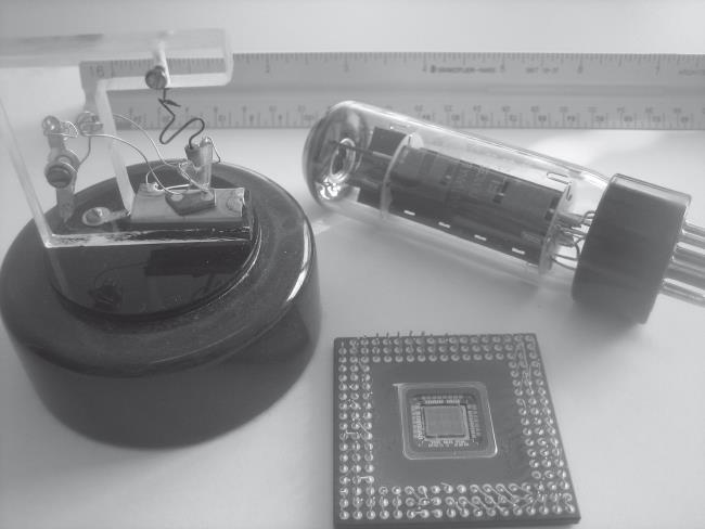 Рис. 1.7. Вакуумная трубка, первый транзистор, микросхема процессора в корпусе