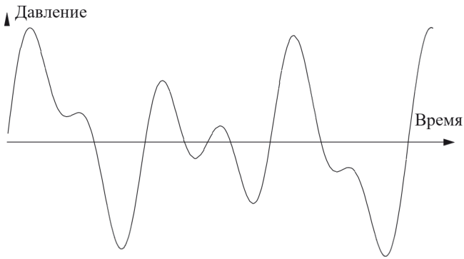 Звук легко визуализировать, если построить график изменения давления воздуха во времени, как показано на рис. 2.4. Значения давления можно передавать любым физическим способом: напряжением или током в электронной схеме, яркостью света или полностью механической системой, как в оригинальном фонографе Эдисона. Высота волн звукового давления здесь соответствует интенсивности или громкости, а по горизонтальной оси отложено время. Число волн в секунду – высота или частота звука.