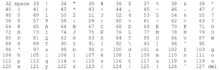 На рис. 2.6 показана часть ASCII; я опустил первые четыре ряда, в которых содержится табуляция, пробел и другие непечатаемые символы.