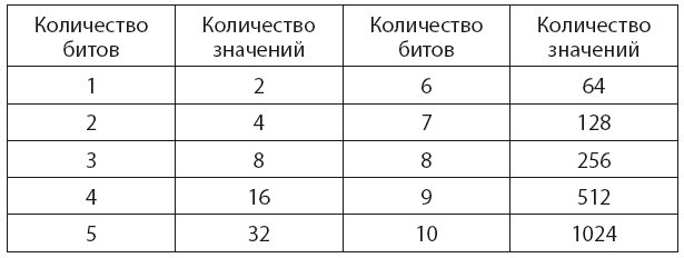 С помощью одного бита мы способны закодировать или представить любую ситуацию, где есть выбор единственного параметра из двух. Таких бинарных вариантов предостаточно: вкл./выкл., истина/ложь, да/нет, высоко/ низко, вход/выход, вверх/вниз, влево/вправо, север/юг, восток/запад и т. д. Одного бита достаточно, чтобы определить, какой элемент из пары выбран. Например, мы можем присвоить «выключить» значение 0, а «включить» – 1, или наоборот. Главное, чтобы все согласились с таким определением.