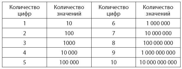 Последовательность битов может отображать число, если считать, что цифры, как обычно, расставлены по разрядам, только с основанием 2, а не 10. Десяти цифр от 0 до 9 достаточно, чтобы обозначить десять предметов. Если их больше, то нам понадобится больше разрядов. Так, с помощью двух десятичных цифр мы сможем обозначить до 100 предметов – от 00 до 99. Для более чем 100 предметов мы возьмем три разряда и получим 1000 комбинаций – от 000 до 999. Нужно отметить, что мы, как правило, не записываем начальные нули для чисел, но они подразумеваются. Кроме того, в повседневной жизни мы начинаем считать от единицы, а не от нуля.