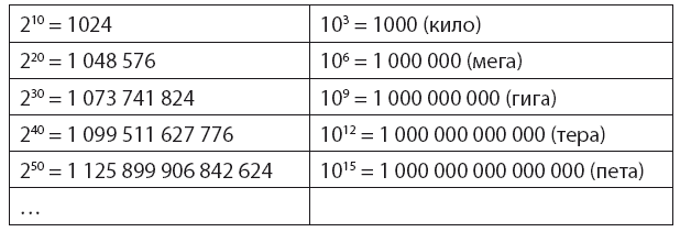 Поскольку все в компьютере обрабатывается в двоичном формате, такие свойства, как размеры и емкости, обычно выражаются в степенях двойки. Если у нас N битов, то возможных значений будет 2N, поэтому удобно знать степени двойки до некоторого значения, скажем, до 210. Совсем большие числа, конечно, уже не стоит запоминать. К счастью, есть простой способ – округление, как показано на рис. 2.10. Определенные степени двойки довольно близки к степеням десятки, причем это сходство упорядоченно и его легко запомнить. На той же иллюстрации показан еще один префикс размера – «пета», или 1015. В глоссарии в конце книги есть более подробная таблица с дополнительными единицами измерения.