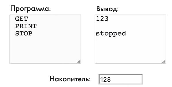Когда эта последовательность выполняется, первая инструкция запрашивает у пользователя число, вторая отображает введенное число, а третья велит процессору остановиться. Это смертельно скучно, но наглядно показывает, что такое программа. Будь у нас реальная машина-игрушка, то программа могла бы даже запуститься.