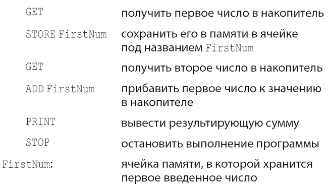 Нам также нужен способ ссылаться на место хранения, когда этого потребуют инструкции программы. Мы можем заметить одну возможность для хранения данных – седьмую ячейку памяти (после шестой инструкции) – и написать «STORE 7». В конечном итоге наша программа будет сохранена в такой форме. Но местоположение (адрес) может меняться при изменении программы. Решение в том, чтобы присвоить ему имя: как мы увидим в главе 5, любая программа способна выполнять такую «конторскую» задачу, то есть отслеживать, где в памяти находятся данные, заменяя имя правильным положением числа. FirstNum указывает, что это «первое число». Имя задается произвольно, хотя рекомендуется использовать то, которое отражает предназначение или смысл связанных с ним данных или инструкций. После имени мы поставили двоеточие, чтобы определить FirstNum как метку. По соглашениям о именовании, инструкции в программе набирают с отступом, а имена, привязанные к инструкциям или ячейкам памяти, – без. В симуляторе Игрушки учитываются все эти детали.