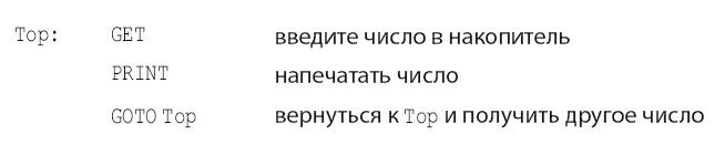 С помощью инструкции GOTO мы можем заставить процессор вернуться к предшествующей части программы и повторить выполнение команд. Вот несложный пример: программа, которая выводит каждое число по мере его ввода. По сути, так работает любая программа, которая копирует или отображает ввод данных для нее, и здесь показывается, что делает инструкция GOTO. Первая инструкция программы, изображенная на рис. 3.6, называется Тор («Верх»). Имя задано произвольно и указывает на ее роль. Наконец, последняя инструкция заставляет процессор вернуться к первой.