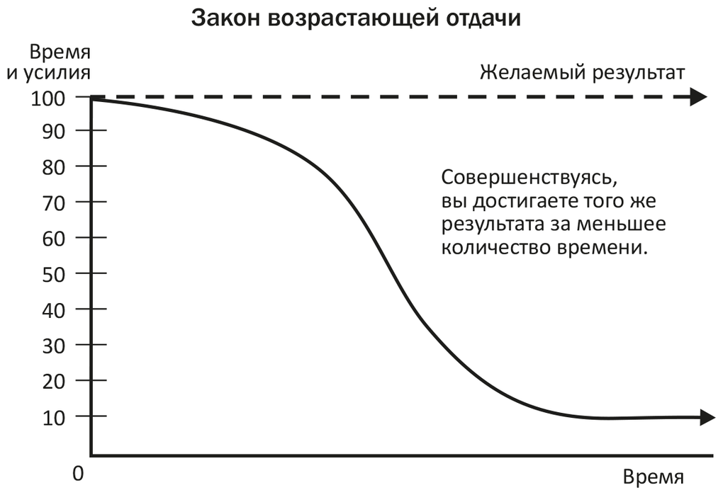 Закон возрастающей отдачи, применяемый к использованию процесса фокусирования, – это закон, обратный небезызвестному закону убывающей отдачи. Закон возрастающей отдачи говорит о том, что чем больше вы сосредоточиваетесь на выполнении небольшого количества заданий, представляющих для вас наибольшую ценность, тем лучше станете в них разбираться и тем меньше времени будет у вас уходить на их выполнение. Прибыль от затраченных усилий и энергии возрастает. Это еще один способ вдвое увеличить свой доход и сократить рабочее время.
