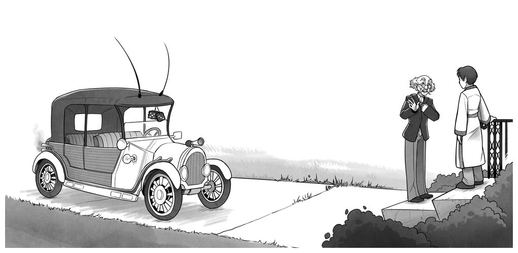– Всенепременно, добрый господин, – ответствовал тот, приподнимая шляпу и принимая от старика пару купюр. Подойдя к машине, заправщик кивнул мне, потом взял бензиновый пистолет и прижал его к боку машины. Между прочим, я успел заметить, что там не было и намека на отверстие бензобака. Так что этот якобы заправщик просто стоял, неизвестно зачем держа пистолет у крыла «форда», и со счастливым видом что-то насвистывал.