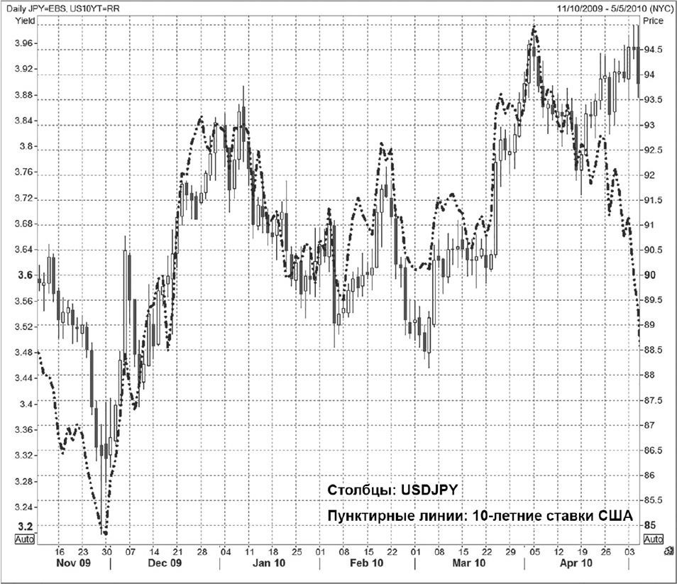 Рисунок 0.1. USDJPY против 10-летних ставок США с ноября 2009 г. по 5 мая 2010 г.