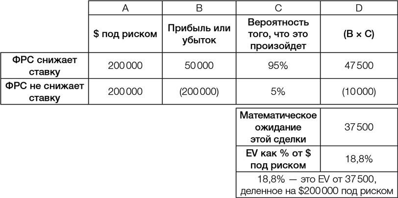 Вернемся к нашему примеру. Допустим, вы считаете, что вероятность того, что ФРС снизит ставки, составляет 95 %. Вот ожидаемая стоимость ставки на это событие в размере $200 000: