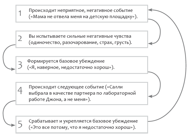 Как только подобные базовые убеждения формируются, вы начинаете все чаще замечать события, чувства и эмоции, которые их подтверждают. Каждый раз, когда происходит событие, напоминающее вам о вашем базовом убеждении, оно укрепляется еще сильнее, порождая цикл негативного мышления, из которого трудно выбраться.