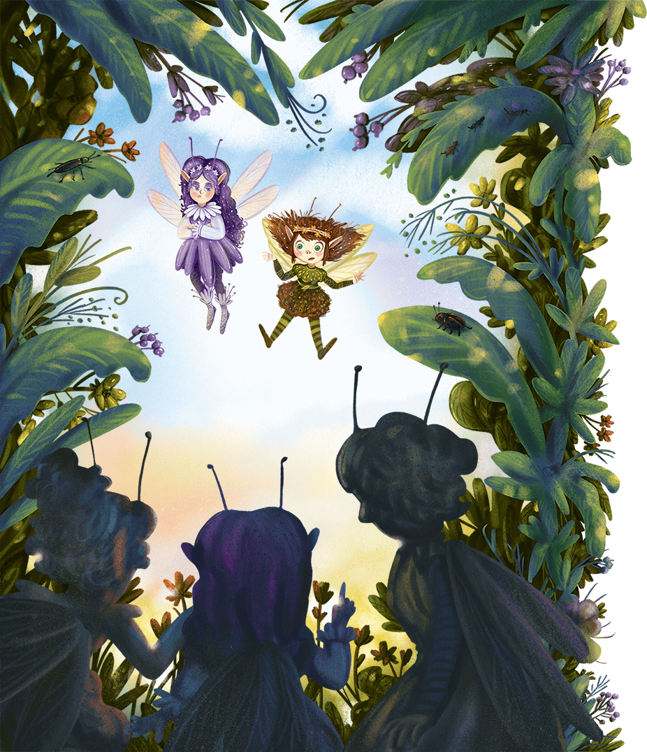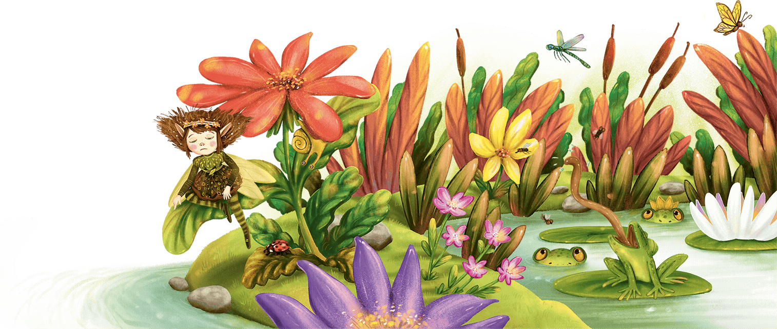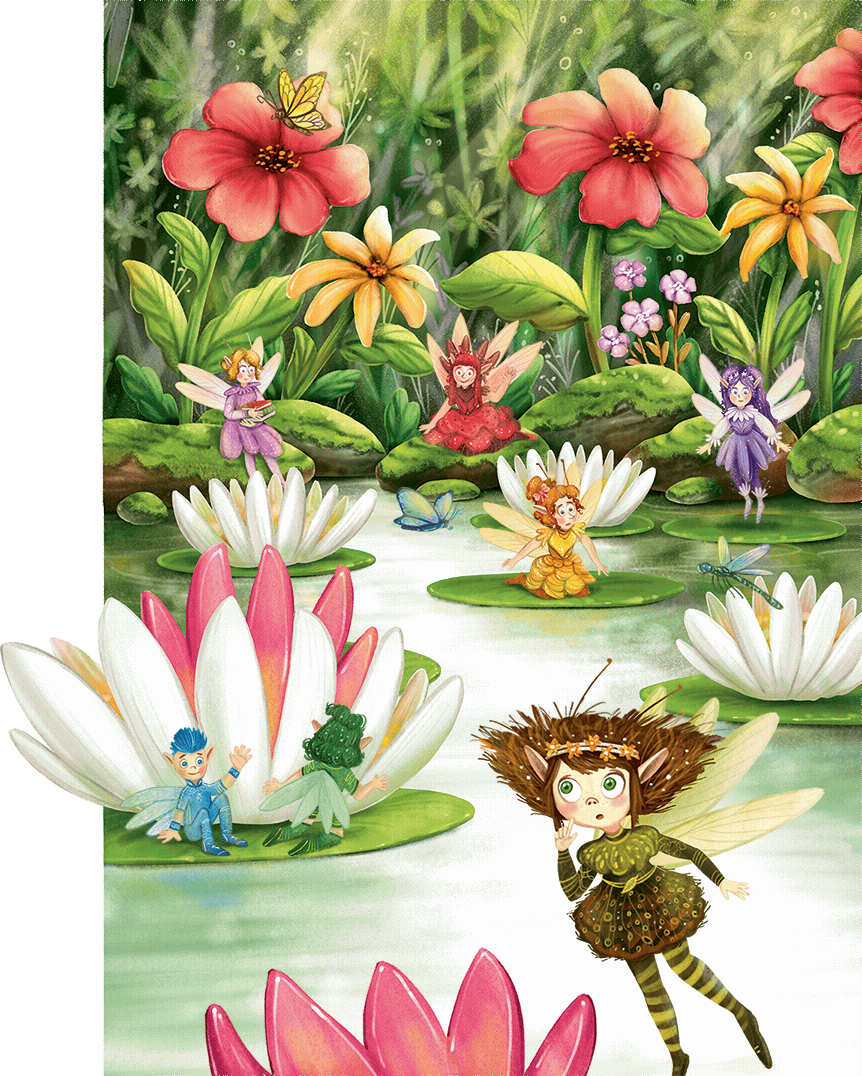 Клара посмотрела по сторонам широко раскрытыми глазами: феи сидели на каждом листе кувшинки, одна приметнее другой. У некоторых – длинные белые волосы, у других – короткие синие, у третьих – жёлтые цветы в волосах и длинные одежды. Ни одной феи, похожей на другую, но у всех было что-то общее: они как будто светились изнутри и выглядели просто волшебно. Магия фей превратила пруд в сплошное море искр. Само присутствие кудесниц заставляло воду сверкать, источая тысячи искорок. Феи по очереди опускались на листки, их торжественно представляли. И только юным феям приходилось представляться самим.