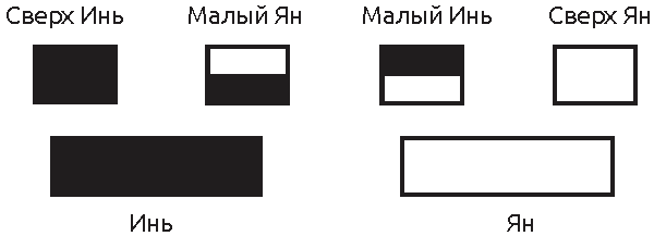 Кроме того, знаки Небо/Цянь и Водоем/Дуй рождаются из Сверх-ян (два ян на первом и втором уровнях), знаки Огонь/Ли и Гром/Чжэнь рождаются из Малого инь (первый ян – второй инь), знаки Ветер/Сюнь и Вода/Кань рождаются из Малого ян (первый ян – второй инь), знаки Гора/Гэнь и Земля/Кунь рождаются из Сверх-инь (первый инь – второй инь). Друг за другом они порождаются друг в друге.