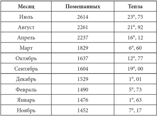 На основании ряда тщательных наблюдений, производившихся непрерывно в течение трех лет в моей клинике, я убедился, что психическое состояние помешанных изменяется под влиянием колебаний барометра и термометра. Так, при повышении температуры до 25, 30 и 32°, в особенности если оно происходит сразу, число маниакальных припадков у сумасшедших увеличивалось с 29 до 50; точно так же в те дни, когда барометр начинал резко колебаться и показывал максимум повышения, число припадков быстро увеличивалось с 34 до 46. Изучение 23 602 случаев сумасшествия доказало мне, что развитие умопомешательства совпадает обыкновенно с повышением температуры весною и летом и даже идет параллельно ему, но так, что весенняя жара, вследствие контраста после зимнего холода, действует еще сильнее летней, тогда как сравнительно ровная теплота августовских дней оказывает менее губительное влияние. В следующие же затем более холодные месяцы замечается минимум новых заболеваний. Прилагаемая таблица показывает это вполне наглядно.