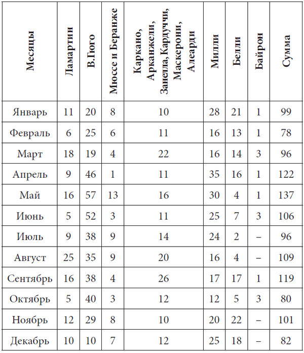 Новейшие поэты – Ламартин, Мюссе, Гюго, Беранже, Каркано, Алеарди, Маскерони, Занелла, Арканжели, Кардуччи, Милли, Белли – имели обыкновение обозначать почти на всех своих мелких и лирических стихотворениях, когда именно каждое из них было сочинено. Пользуясь этими драгоценными указаниями, мы составили следующую таблицу.