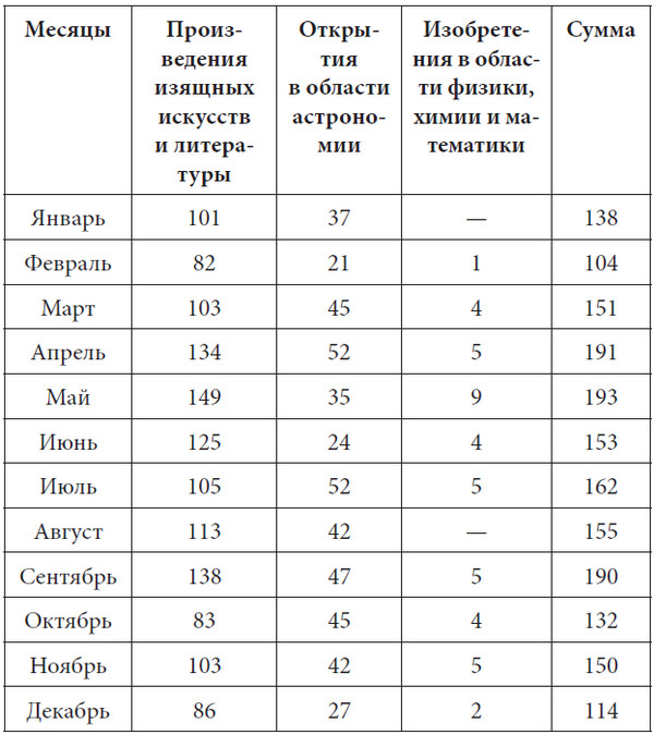 Из этой таблицы мы видим, что для художественного творчества наиболее благоприятным месяцем оказывается май, за ним следуют сентябрь и апрель, тогда как наименее производительными месяцами были февраль, октябрь и декабрь. То же самое заметно отчасти и по отношению к астрономическим открытиям, только для последних преобладающее значение имеют апрель и июль. Открытия в точных науках, как наибольшее число эстетических работ, а вследствие того и общее число всех произведений, преобладают точно так же в мае, апреле и сентябре, т. е. в течение не особенно жарких месяцев, когда барометрические колебания более часты сравнительно с самыми жаркими и холодными месяцами.
