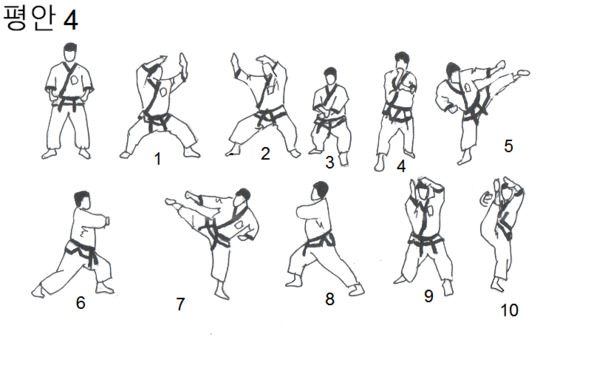 Для иллюстрации формальных комплексов Тансудо приведу ученический комплекс Пёнг Ан Са Дан Хёнг. Рисунок этого хён очень похож на рисунок ката Шотокан Пинан Ёндан. Тем не менее отличия в стойках и переходах, а главное в манере выполнения существенные.