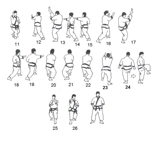 25.Опускаем ногу и сразворотом шагаем в левую заднюю стойку хугуль джасе с блоком двумя руками судо годыро чундан макки.