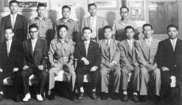 Нижний ряд, слева направо: Хван Ки (Му Дук Квана); Юн Тхэ Ен (вероятно, Джидокван); Чхве Хон Хи (в форме), Ро Бен Джик (Сон Му Кван), неизвестный представитель Корейской спортивной ассоциации, Ли Нам Сук (Чанг Му Кван), Ум Ун Кю (Чон До Кван) и Хен Чжон Мен (Чон и О До кваны). Верхний ряд слева: Ким Сун Бэ (Чан Му Кван), Ко Чжэ Хва (Чон и О До кваны), Нам Тхэ Хи (Чон До Кван); неизвестный; неизвестный. Фото предоставлено Чхве Хон Хи.