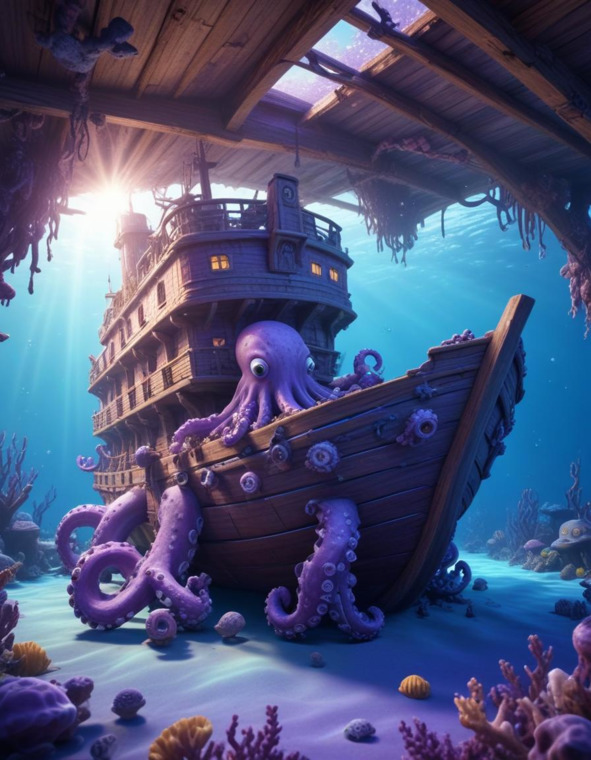 Продолжая своё путешествие, Дабыл-Дабылдыч встретил осьминога с большими умными глазами, которые казались полными мудрости. Его щупальца светились в темноте, а движения были плавными и точными. Осьминог выглядел слегка рассеянным, но его голос был спокойным и уверенным.