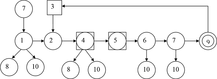 1 – инкубация яиц до заселения садков; 2 – заселение садков; 3 – получение яиц ситотроги; 4 – кормление личинок 2-го возраста; 5 – кормление личинок 3-го возраста; 6 – сбор коконов; 7 – содержание имаго; 8 – выпуск в поле, теплицах; 9 – хранение имаго зимой; 10 – временное хранение