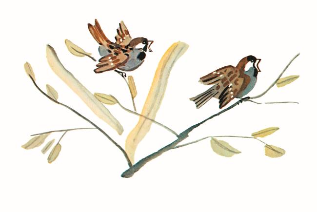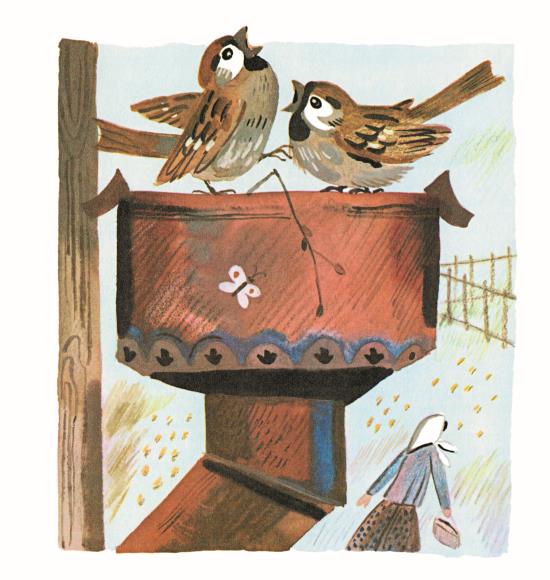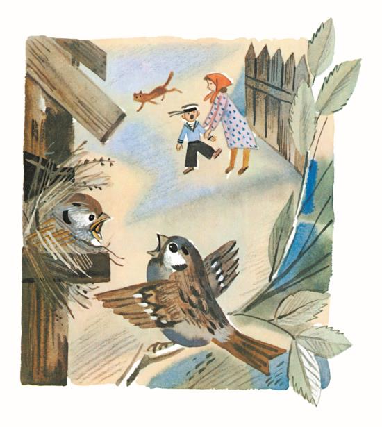 У воробьёв совсе́м так же, как у люде́й: взро́слые воробьи́ и воробьи́хи – пичу́жки ску́чные и о́бо всём говоря́т, как в кни́жках напи́сано, а молодёжь – живёт свои́м умо́м.