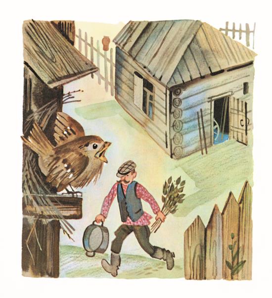 Он потря́хивал кры́льями и, гля́дя на зе́млю, чири́кал: