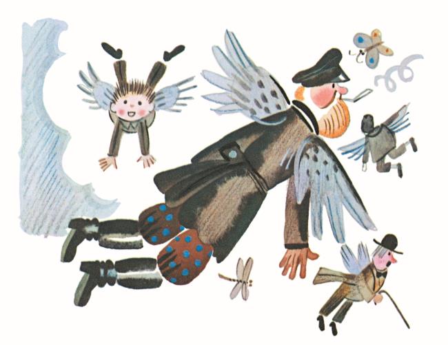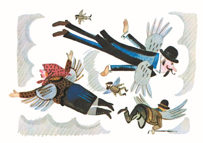 – Чушь! – сказа́л Пу́дик. – Чушь, чепуха́! Все должны́ име́ть кры́лья. Чать на земле́ ху́же, чем в во́здухе!.. Когда́ я вы́расту большо́й, я сде́лаю, что́бы все лета́ли.