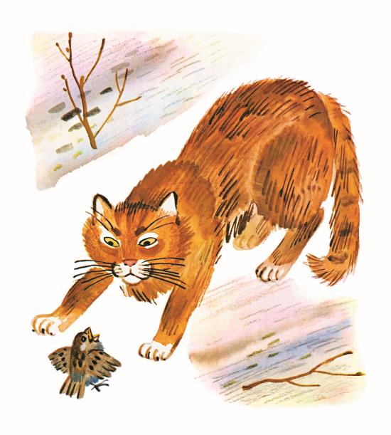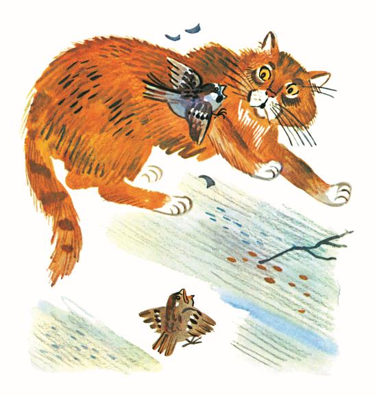 А ко́шка сиди́т на земле́, счища́я с ла́пы воробьи́хины пе́рья, смо́трит на них – ры́жая, зелёные глаза́ – и сожали́тельно мяу́кает: