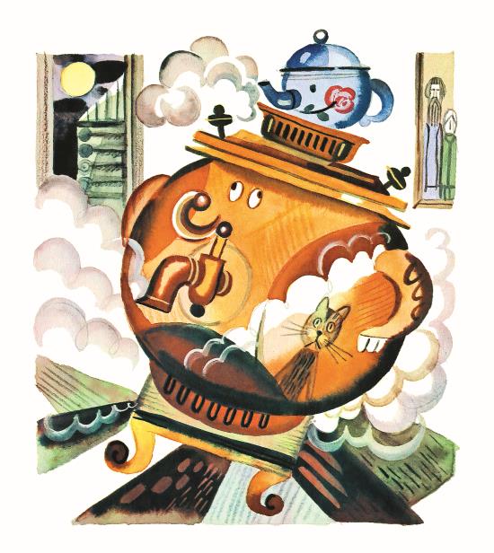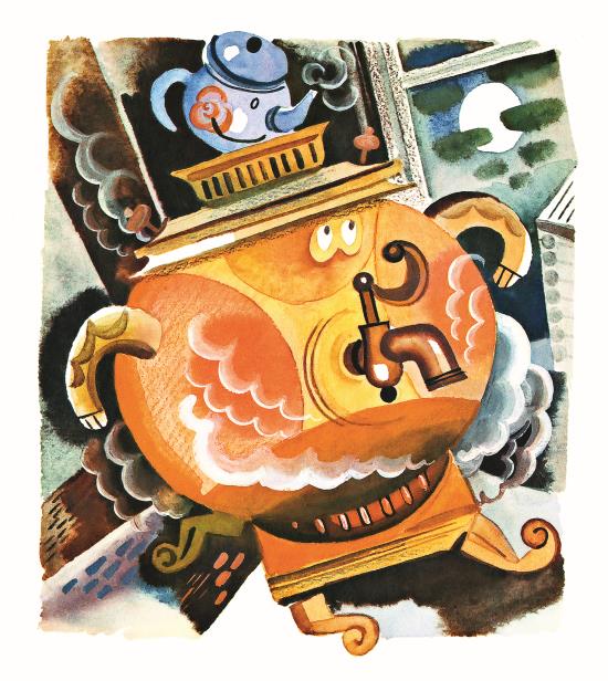 А самова́р чу́вствовал себя́ совсе́м пло́хо: вода́ в нём давно́ вся вы́кипела, а он раскали́лся, кран у него́ отпая́лся и пови́с, как нос у пья́ного, одна́ ру́чка то́же вы́вихнулась, но он всё ещё храбри́лся и гуде́л, гля́дя на луну́: