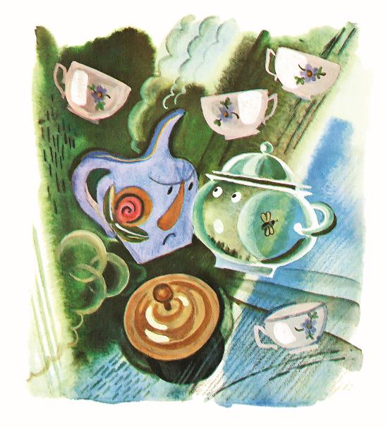 Так они́ о́ба всё кипе́ли и кипе́ли, меша́я спать всем, кто был на столе́. Ча́йник дра́знит:
