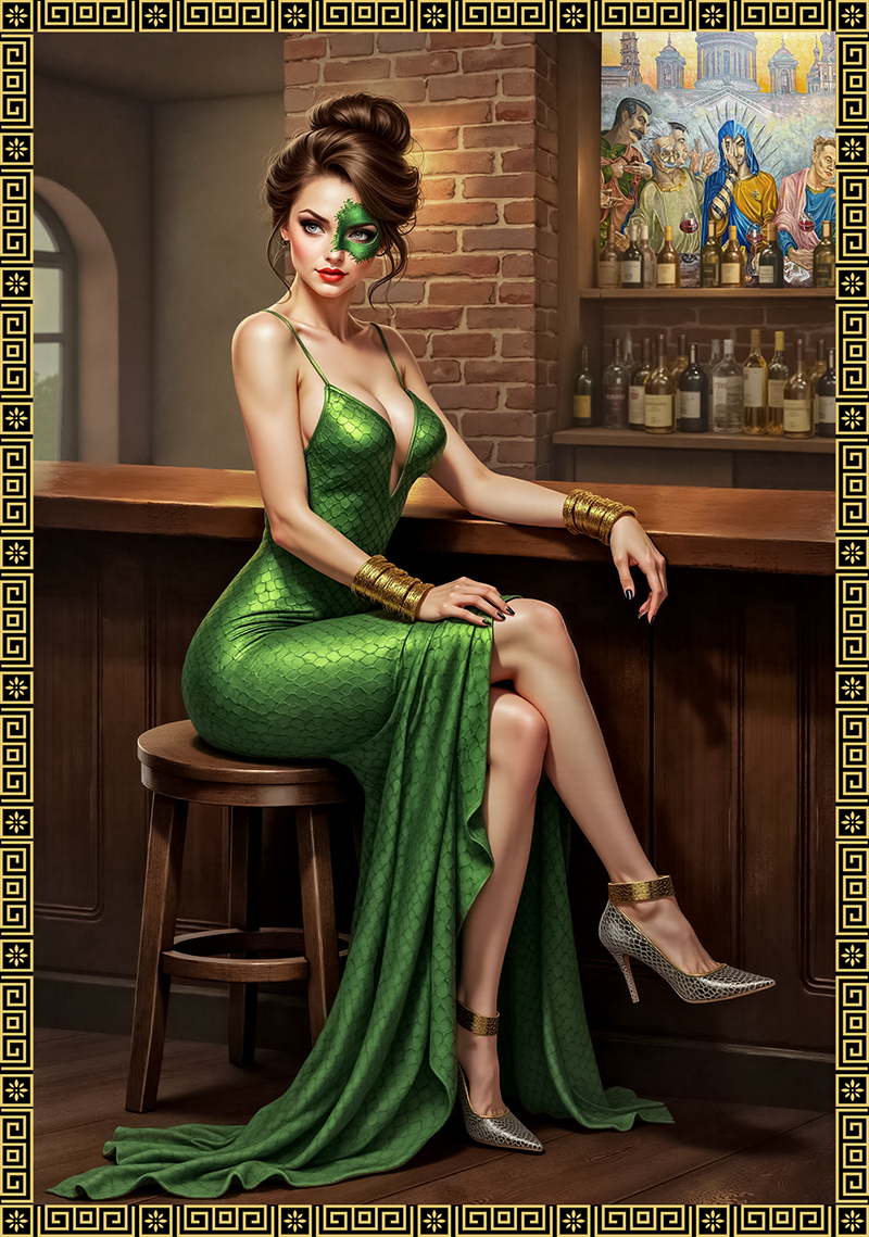Краем глаза заметил переливающееся платье, и передо мной опустился поднос с шестью рюмками. Затем незнакомка, а это была явно не та девушка, которая стояла за стойкой, грациозно опустилась на стул напротив меня. На лице её была та же самая маска, которая смотрела на меня с витрины. На руках золотые браслеты. Стройное тело с практически идеальными пропорциями было затянуто сверкающей зелёной тканью. Я даже не знаю, как эта обтягивающая штука называется-то. Но ткань, драпируя всё тело, практически ничего не скрывала, наоборот, подчёркивала самые большие достоинства. Акция у них, что ли? Закажи два сета и получи обворожительную незнакомку в соседки по столику. Вряд ли это посетительница.