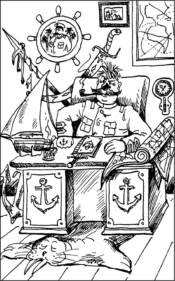 Вместо скромного отставного аптекаря за столом, углубившись в чтение какой-то древней книги, сидел грозный капитан в полной парадной форме, с золотыми нашивками на рукавах. Он свирепо грыз огромную прокуренную трубку, о пенсне и помину не было, а седые, растрепанные волосы клочьями торчали во все стороны. Даже нос, хотя он действительно и покраснел, стал у Врунгеля как-то солиднее и всеми своими движениями выражал решительность и отвагу.
