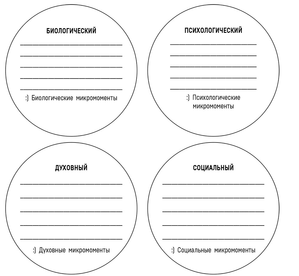 Теперь ваша очередь. Предлагаю вам сделать свои Четыре круга счастья на листке бумаги или на каком-либо устройстве. Впишите в четыре круга эти названия: