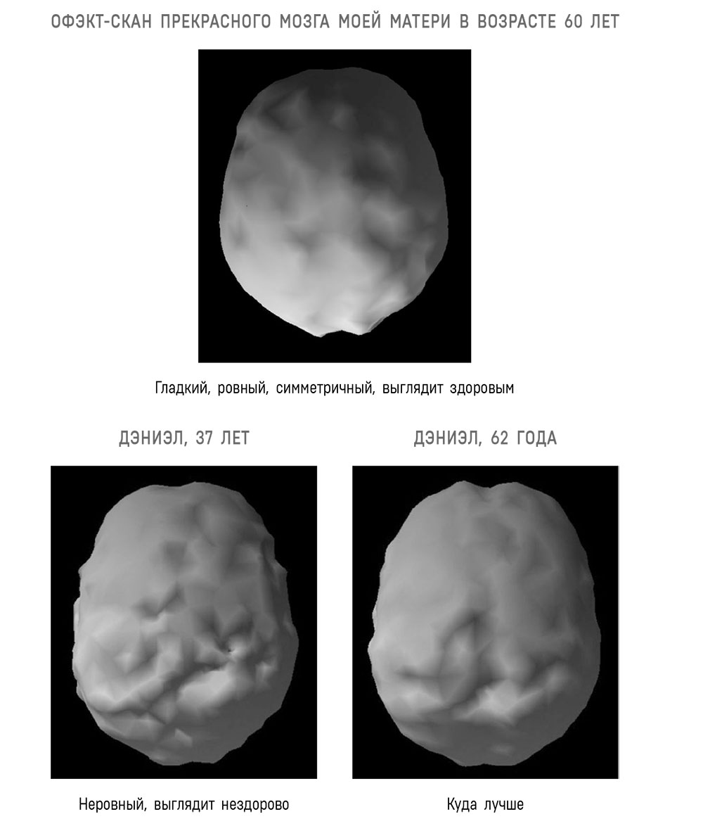 Сравнив свой ОФЭКТ-скан со сканом моей матери, я позавидовал ее мозгу. Мне хотелось обладать таким же здоровым мозгом, как у нее, так что я начал работать над собой. Достаточно быстро состояние моего мозга улучшилось и остается таким по сей день. Прошли десятилетия, и скан моего мозга куда лучше, глаже и здоровее. Это стало основополагающим принципом работы клиники Амена: «Вы не обязаны жить с текущим состоянием мозга. Вы можете его улучшить, и мы можем это доказать». Это касается не только меня, но и десятков тысяч наших пациентов. Вместе с улучшением состояния мозга ваша жизнь становится лучше, счастливее и успешнее.