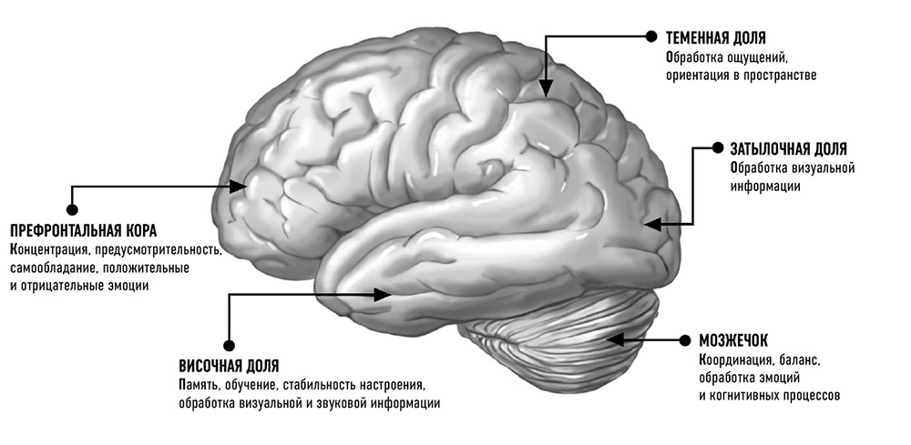 • Височные доли: височные доли находятся прямо под висками и за глазами. Они отвечают за наше понимание языка, умение обрабатывать то, что мы слышим, за обучение, память и эмоции. Их называют «Путь „что?“», ведь именно они определяют, что за объект перед нами. В височных долях находятся две крайне важные части лимбической системы (эмоционального мозга): гиппокамп, который отвечает за память и настроение, и миндалевидное тело (эмоциональные реакции и страх).